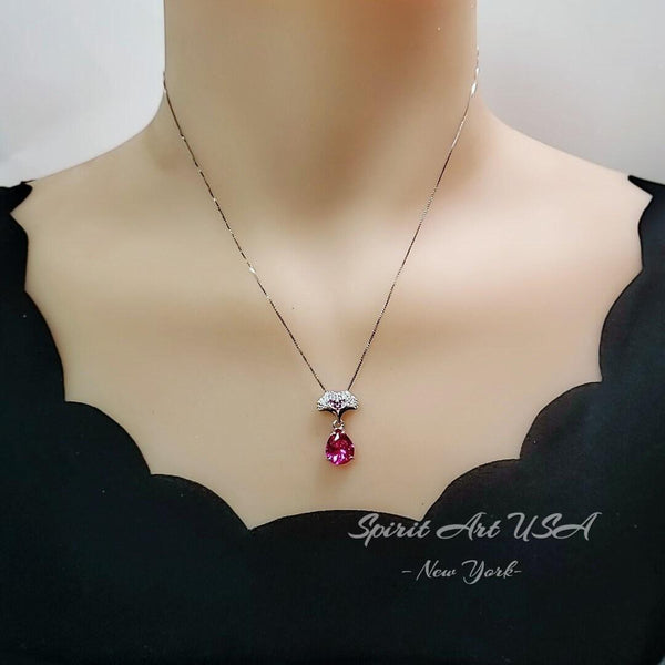 Large Teardrop Deep Pink Fuchsia Sapphire Ginkgo biloba Style Necklace