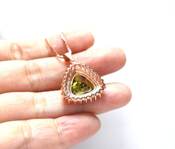 Large Triangle Green Peridot Necklace - Rose Gold Coated Sterling Silver High Quality Trillion Cut 8 CT Peridot Pendant #727