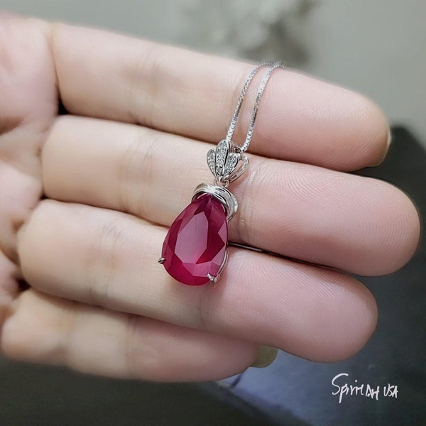 5.5 CT Teardrop Red Ruby Necklace, Diamond Crown Flower Red Ruby Pendant, Sterling Silver White Gold Plated July Birthstone 1029