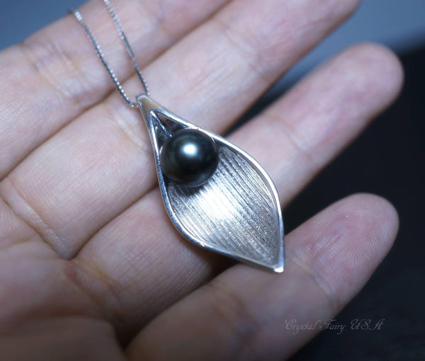 High quality genuine Black pearl sterling silver leaf style necklace