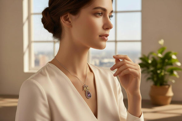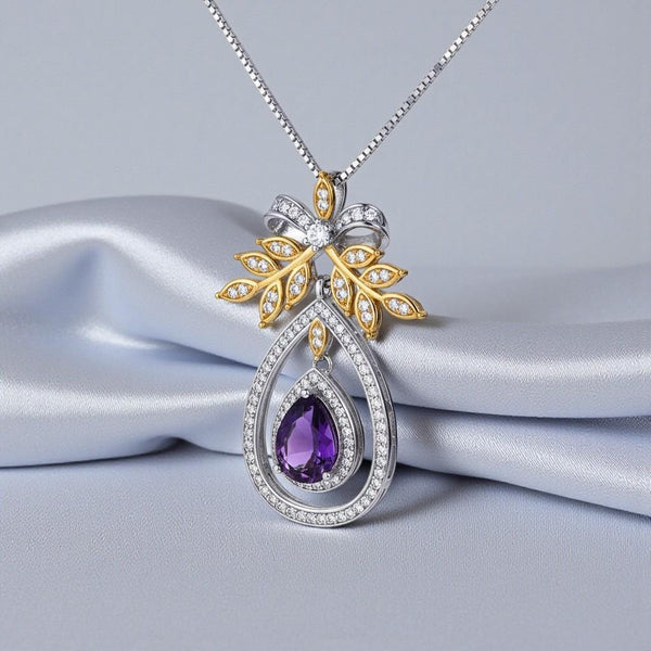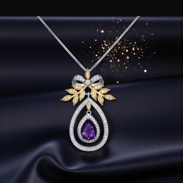 Elevate your style with this exquisite genuine amethyst pendant, featuring a vibrant pear-cut gemstone nestled within a shimmering teardrop halo. The design is beautifully accented with an 18K gold-plated olive branch and a delicate bow, symbolizing peace and elegance.