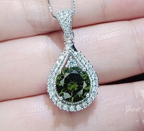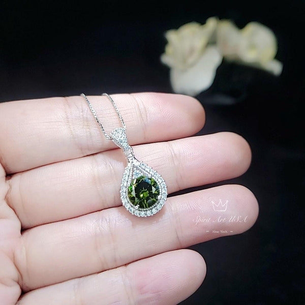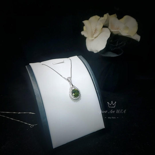 Round Peridot Necklace Sterling Silver 2 CT Sim Gemstone Green Pendant August Birthstone Teardrop Style Solitaire Lab Created #156