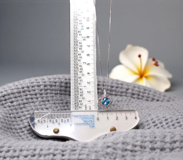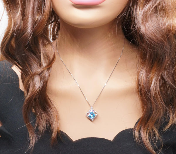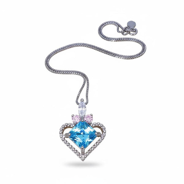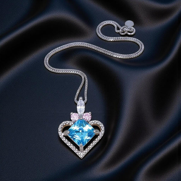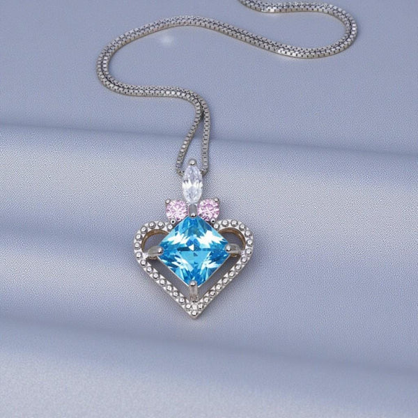 Capture the essence of romance with this stunning square brilliant cut Blue Topaz necklace. Encased in a delicate, sparkling heart-shaped frame, the vibrant blue gemstone is accented by petite pink and white stones for a unique, colorful touch. Meticulously crafted from 925 sterling silver with an 18k gold coating, this piece offers lasting shine and elegance. It comes with an adjustable chain, making it a versatile and thoughtful gift for birthdays, anniversaries, or special occasions.
