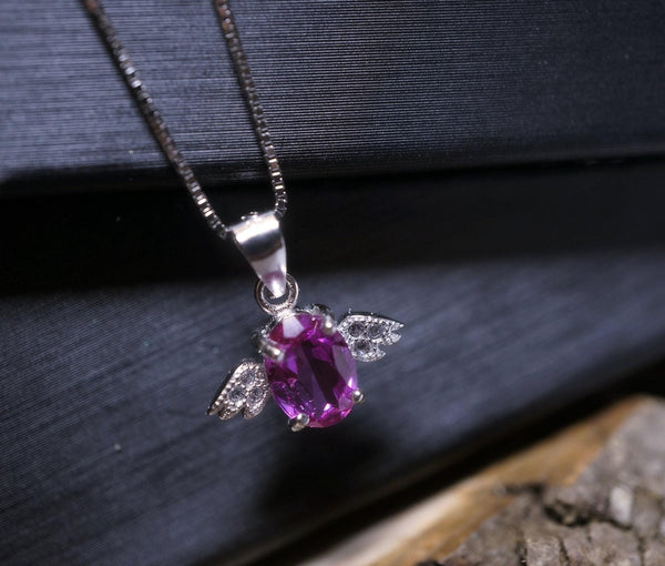 The main stone is a lovely lab-created red ruby, measuring 5 x 7 mm in diameter, securely held in a delicate sterling silver bezel. The necklace comes with a high-quality 0.7 mm glittering platinum-coated sterling silver box chain, offering both durability and a lustrous finish.