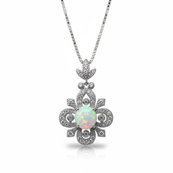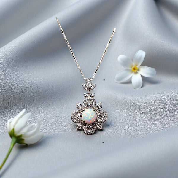 Timeless Floral Design: This pendant features a brilliant 8mm lab-created white opal set in a handcrafted vintage-style floral filigree, symbolizing hope and purity.