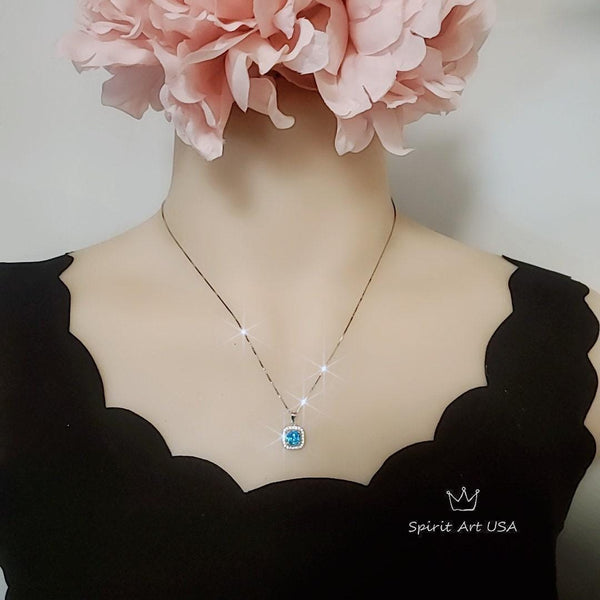Minimalist Blue Topaz Necklace Sterling Silver Tiny Halo Square Solitaire Tiny Blue Topaz Pendant - November Birthstone 020