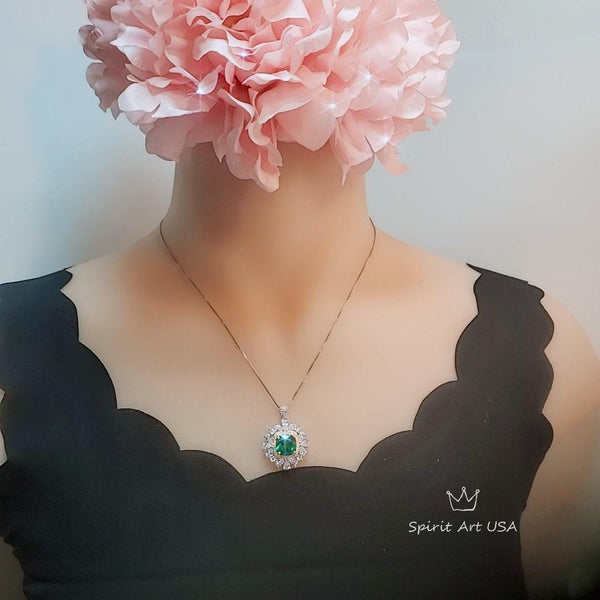 Large Square Emerald Necklace Gemstone Halo Gold Square 7 CT 10 MM Green Emerald Pendant Sterling Silver White Gold plated #809