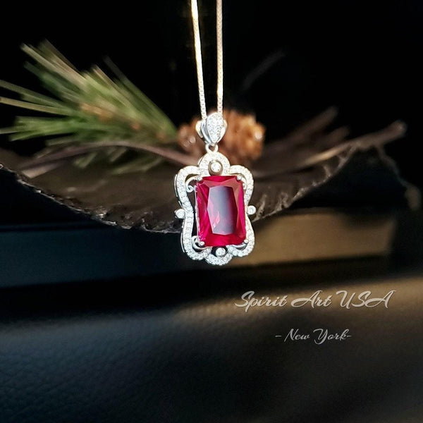 Gemstone Flower Red Ruby Necklace - Large Rectangle Baguette Cut Ruby Pendant - 18KGP @ Sterling Silver - July Birthstone #802
