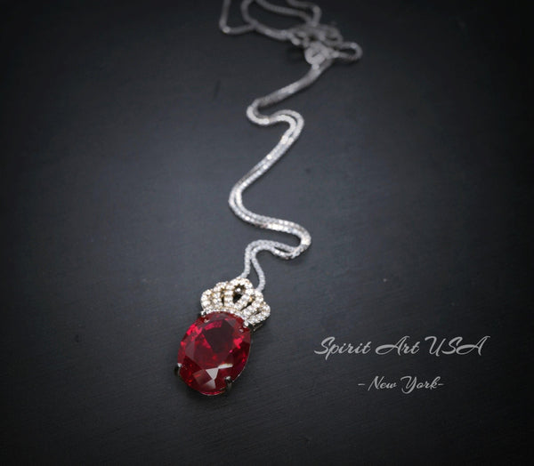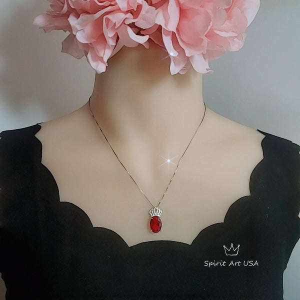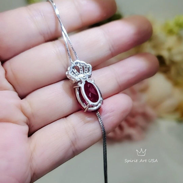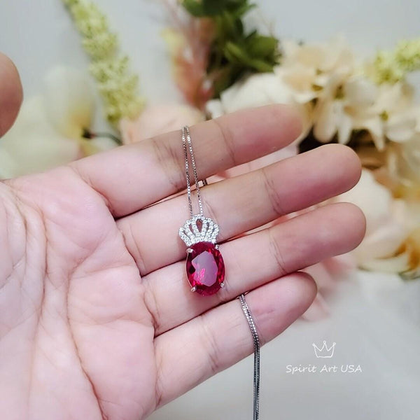 Large Ruby Necklace - Sterling Silver with 18kgp - Solitaire 7 CT Gemstone Crown Red Ruby Pendant - Oval Cut - July Birthstone #839