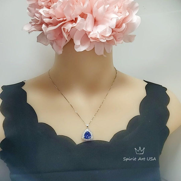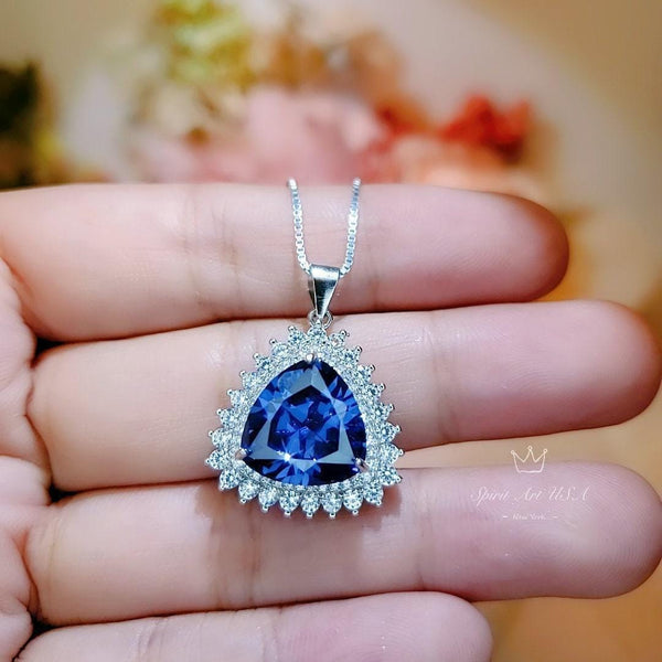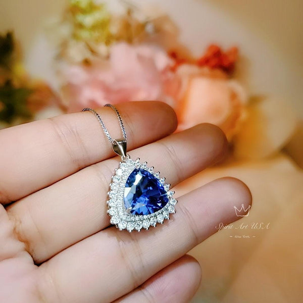 Large Trillion Tanzanite Necklace - Sterling Silver Solitaire Halo December Birthstone Triangle Lab Created Energic Tanzanite Pendant #774