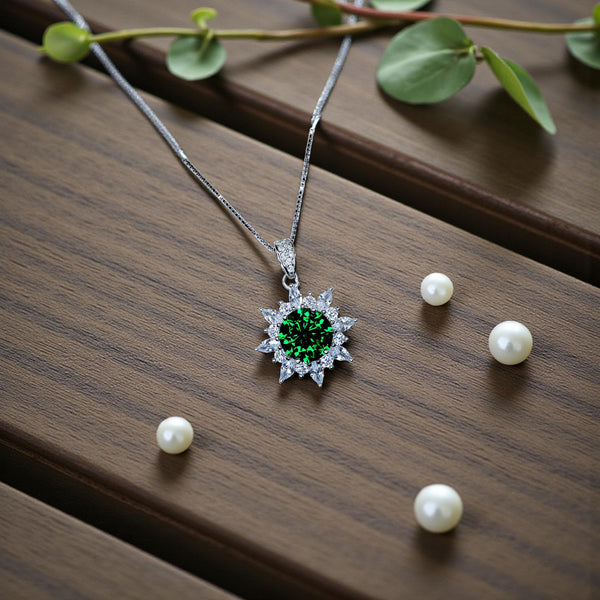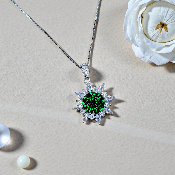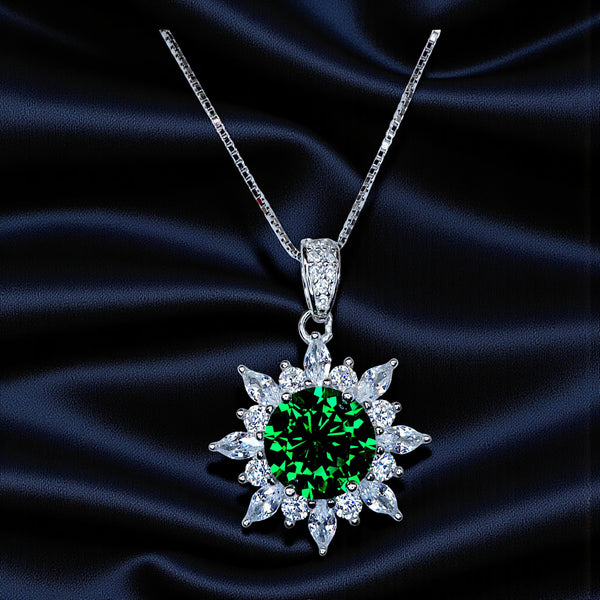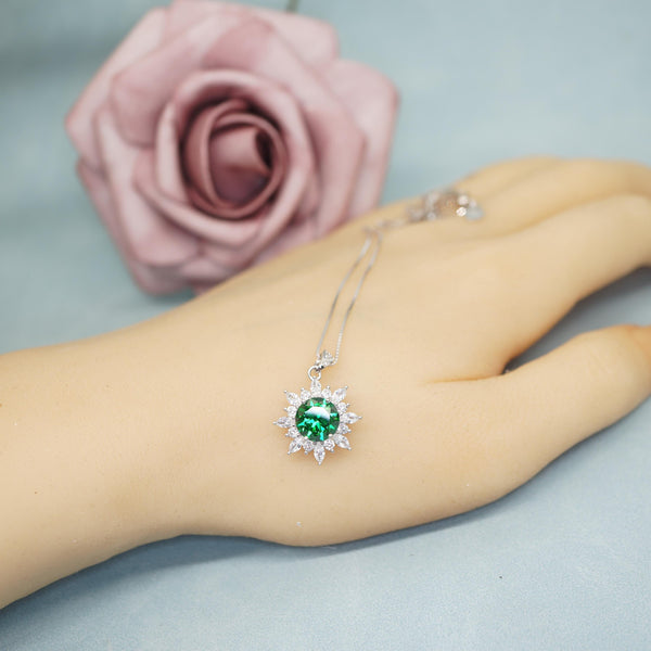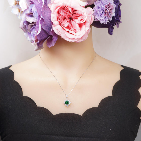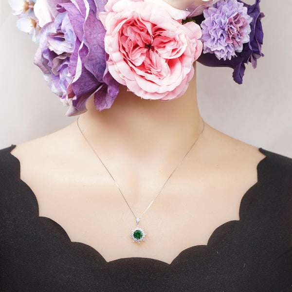 Introducing our magnificent Lab Created Diopside Sunburst Halo Necklace, an eye-catching piece that combines the deep, mesmerizing green of Diopside with a spectacular, sparkling white stone halo. This is our exclusive shop design!