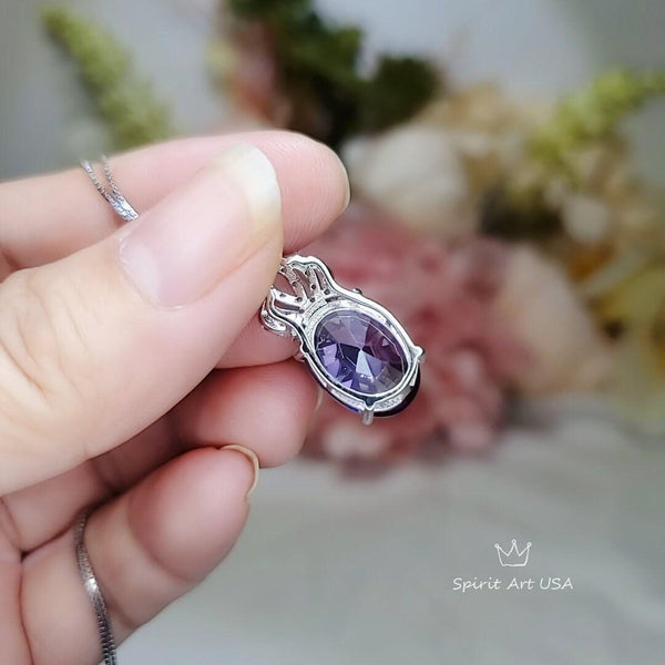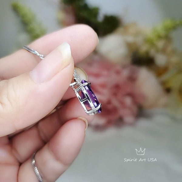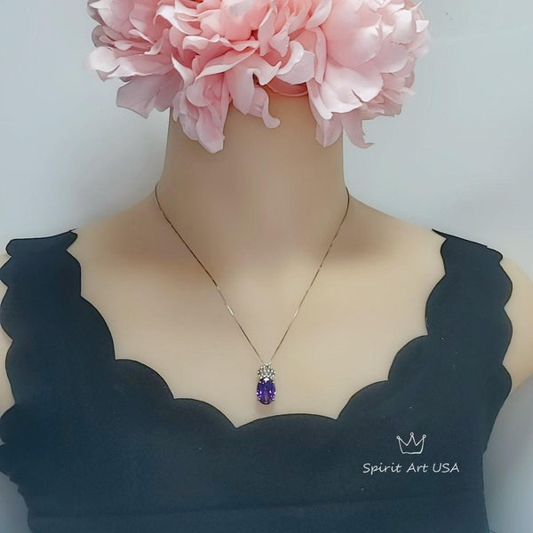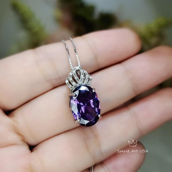 Created synthetic Amethyst Necklace - Diamond Crown 6 CT Amethyst Pendant - Sterling Silver White Gold Plated Large Purple Jewelry #657