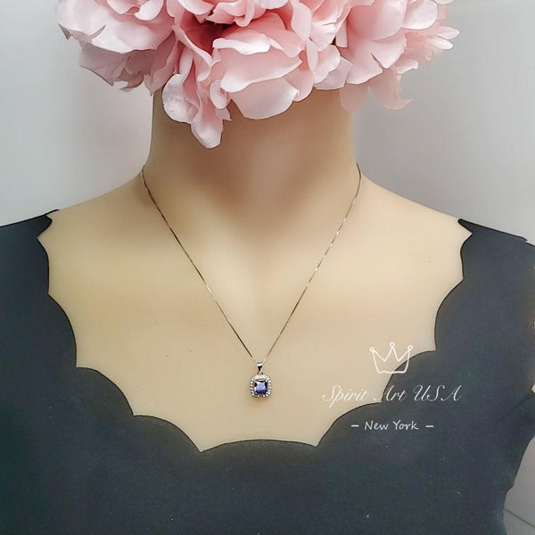 Introduce a touch of elegance to your jewelry collection with our Minimalist Amethyst Necklace. This stunning piece features a lab-created amethyst, skillfully set in a halo solitaire design, showcasing a gorgeous 1 ct synthetic purple gem. Crafted with love by artisans, this necklace combines minimalist style with a unique square design, making it an ideal birthstone gift for those born in February.