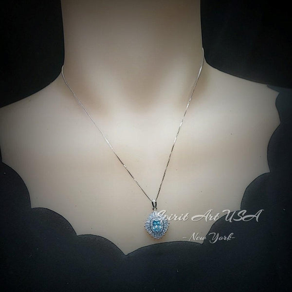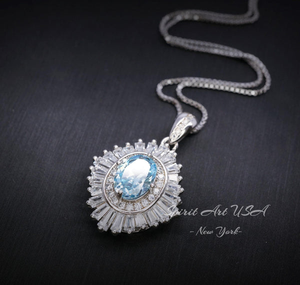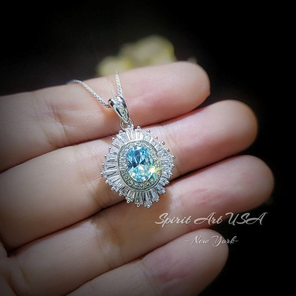 Luxury Aquamarine Necklace - Halo Sim Gemstone 18kgp @ Sterling Silver - Sky Blue Aquamarine Pedant - March Birthstone #537