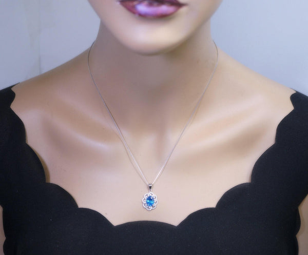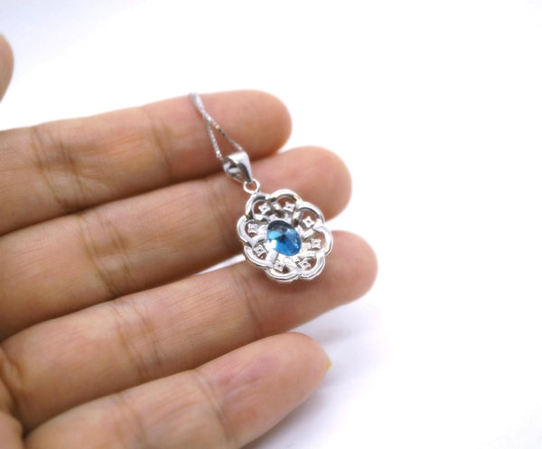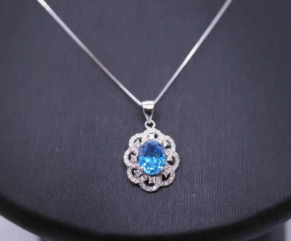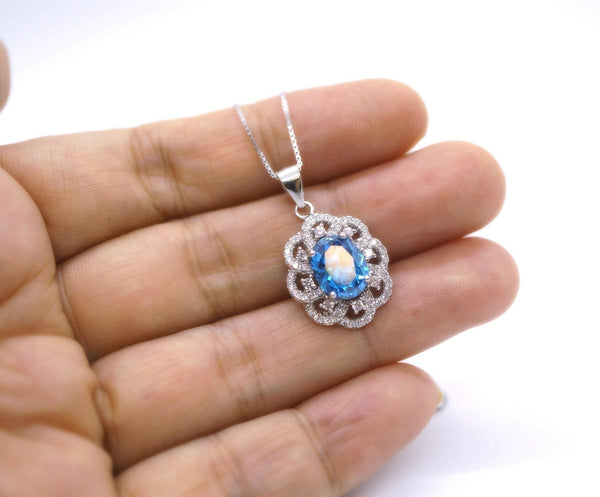 Blue Topaz Necklace - Gemstone Flower Of Life Pendant - 18KGP @ Sterling Silver 2 CT Oval Cut Blue Topaz Pendant - November Birthstone #368