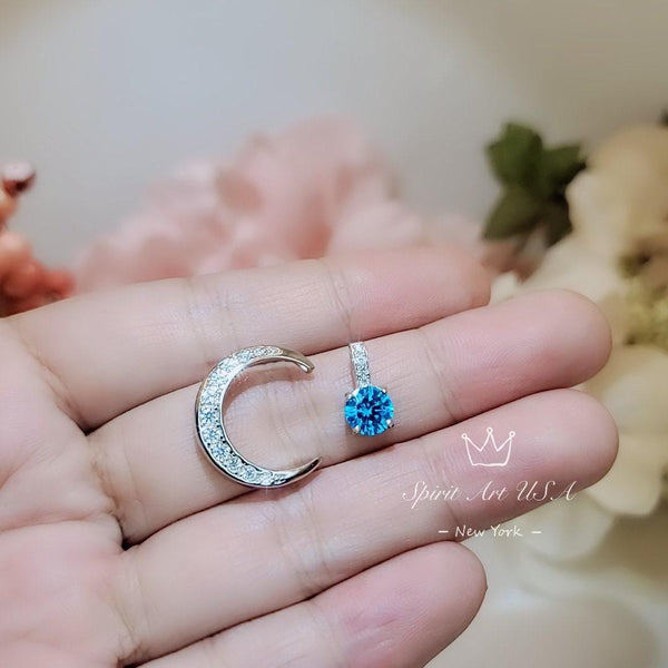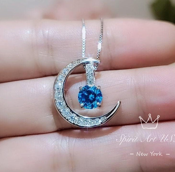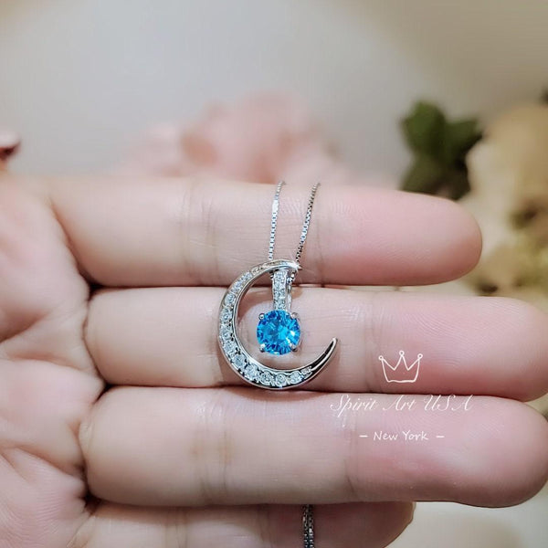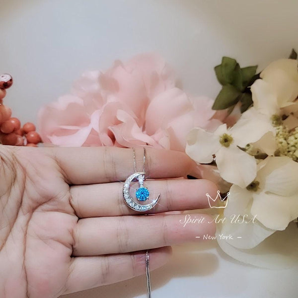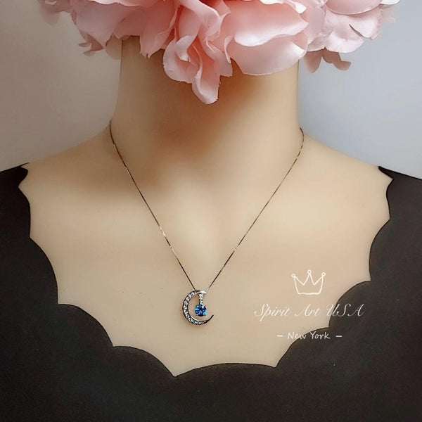 Blue Topaz Necklace Crescent Moon Pendant Sterling Silver Two Separated Pendant #229