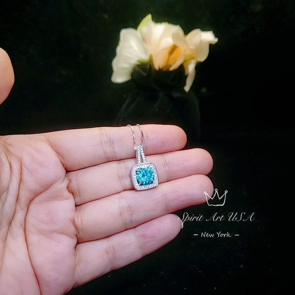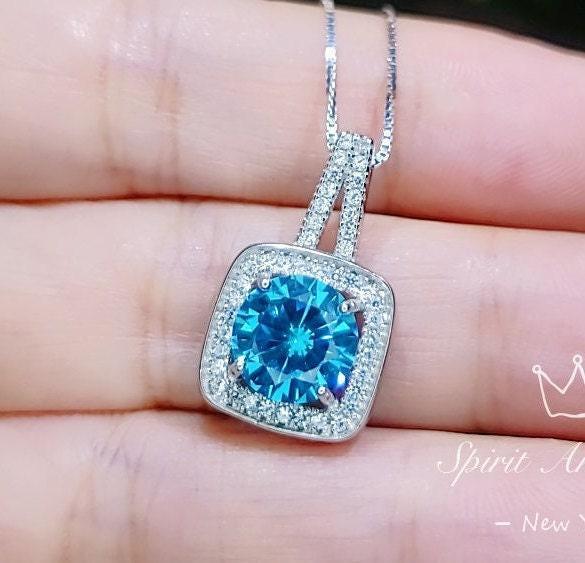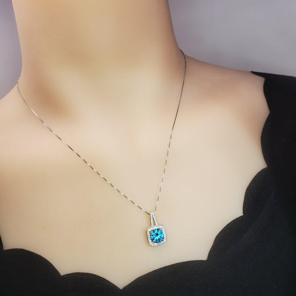 Blue Topaz Necklace - Sterling Silver Square Solitaire November Birthstone Round Topaz Jewelry Gemstone White Gold Plated #276