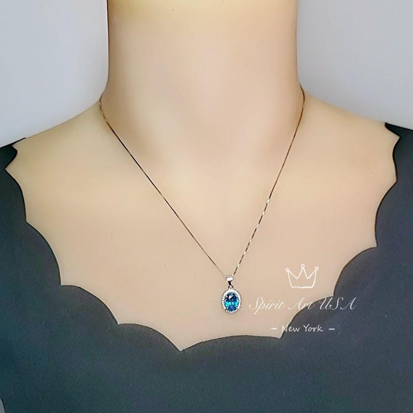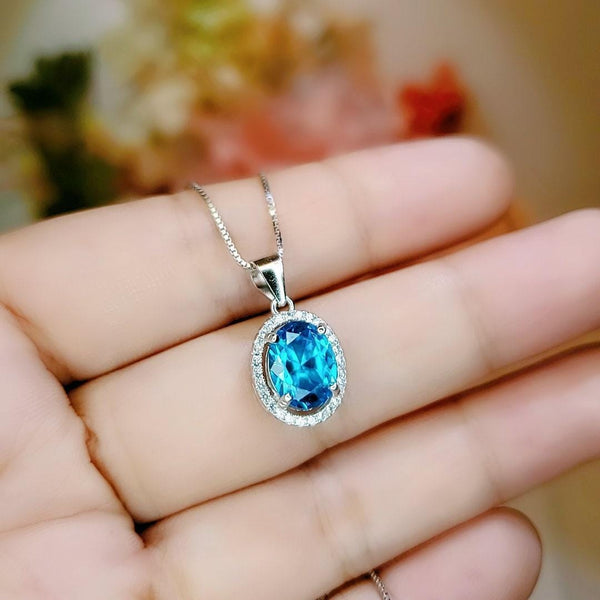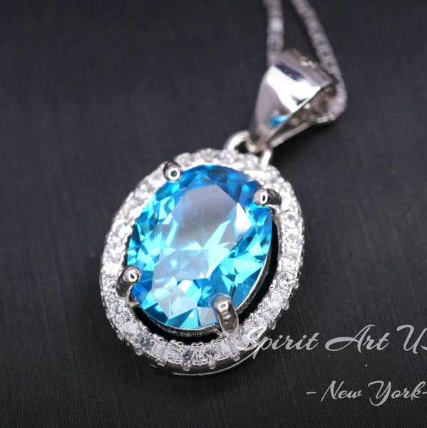 Dainty Blue Topaz Necklace - Sterling Silver Solitaire Blue Topaz Pendant - Halo Oval Gemstone Surround Jewelry #262
