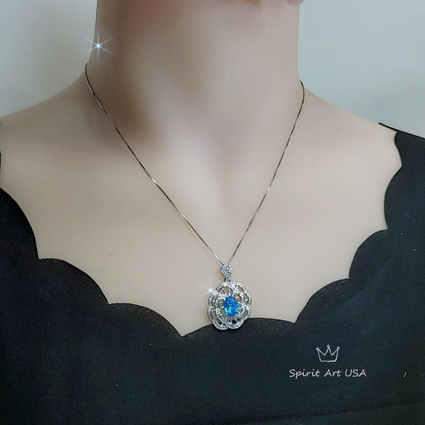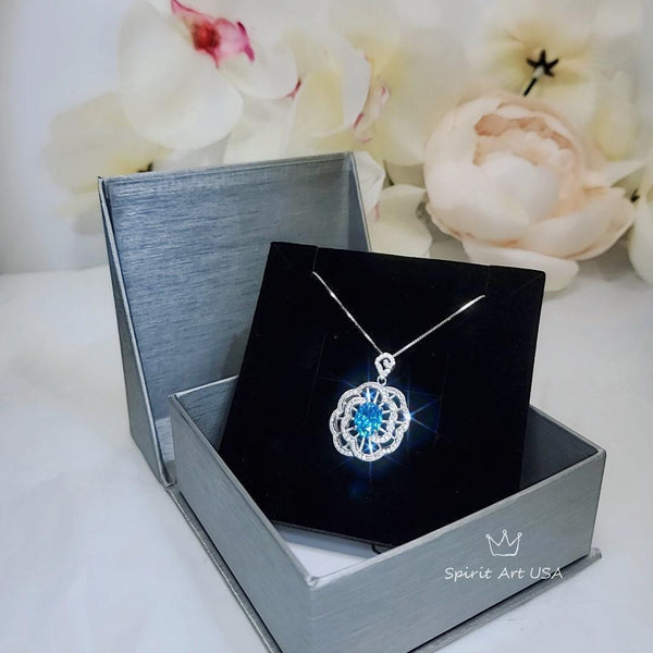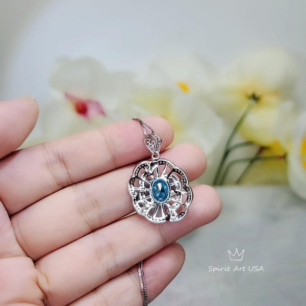 Gemstone Peony Blue Topaz Necklace, 2.1 CT Blue Gemstone Pendant White Gold plated Sterling Silver Flower Jewelry #556