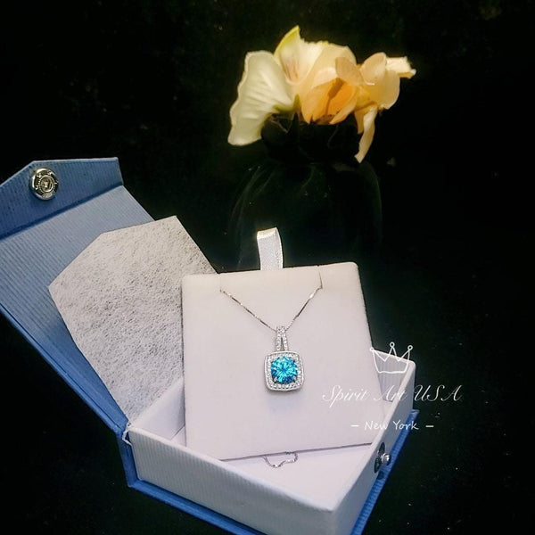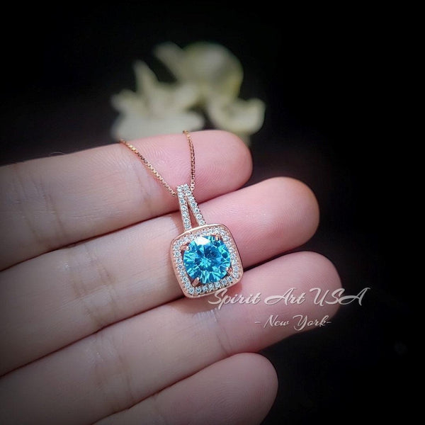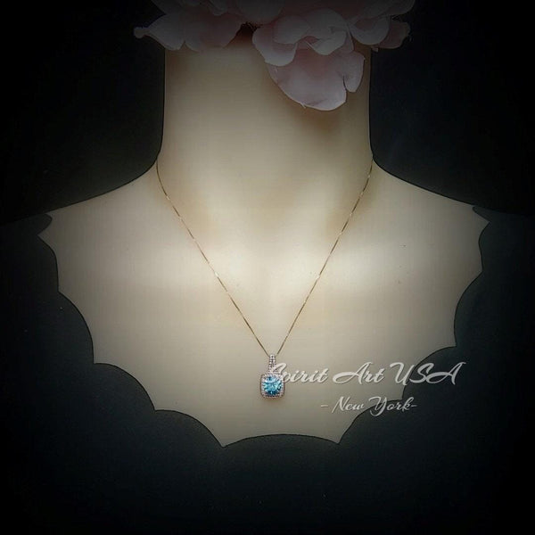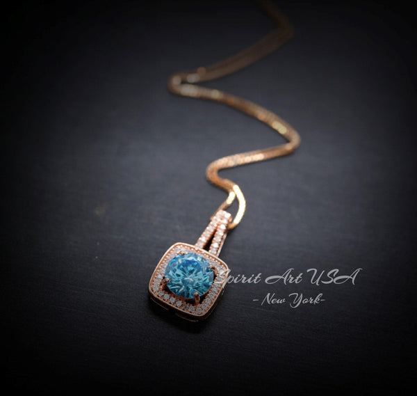 Rose gold Blue Topaz Necklace - Sterling Silver - Square Solitaire November Birthstone Round Topaz Jewelry Diamond Halo Round Cut 8 MM #184