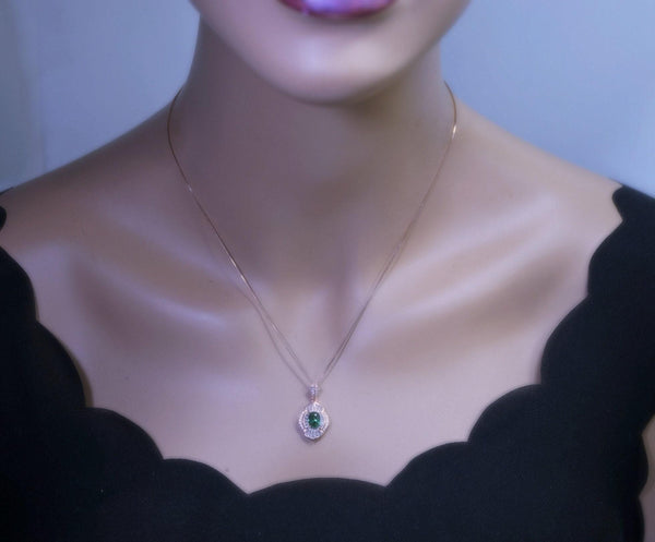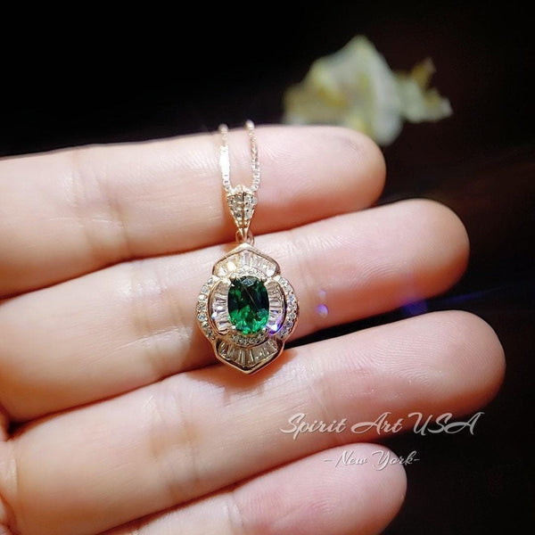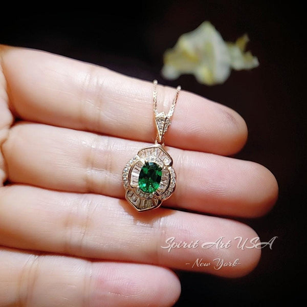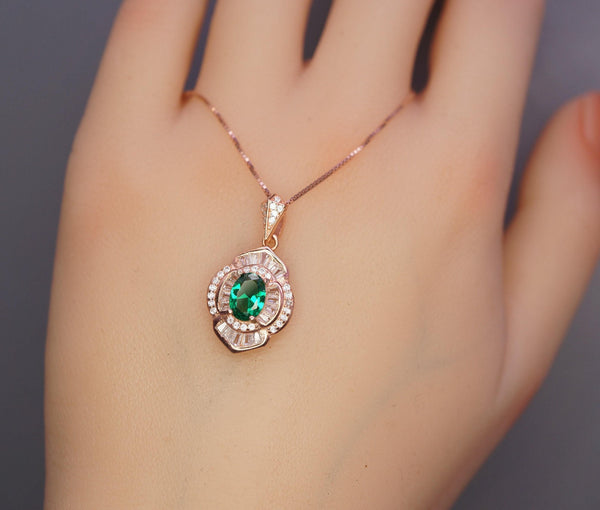 Double Halo Gemstone Rose Gold Emerald Necklace Sterling Silver Flower of Life 1 ct Green Gemstone Pendant Dainty Emerald Pendant #370