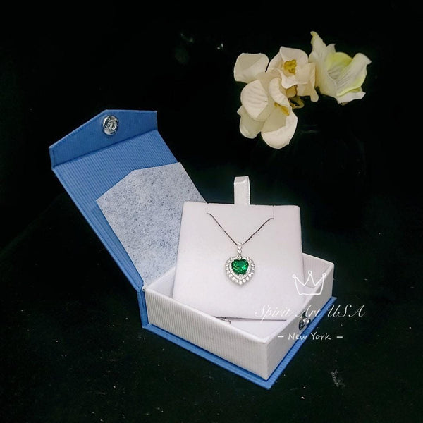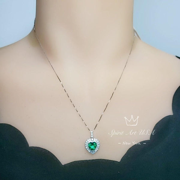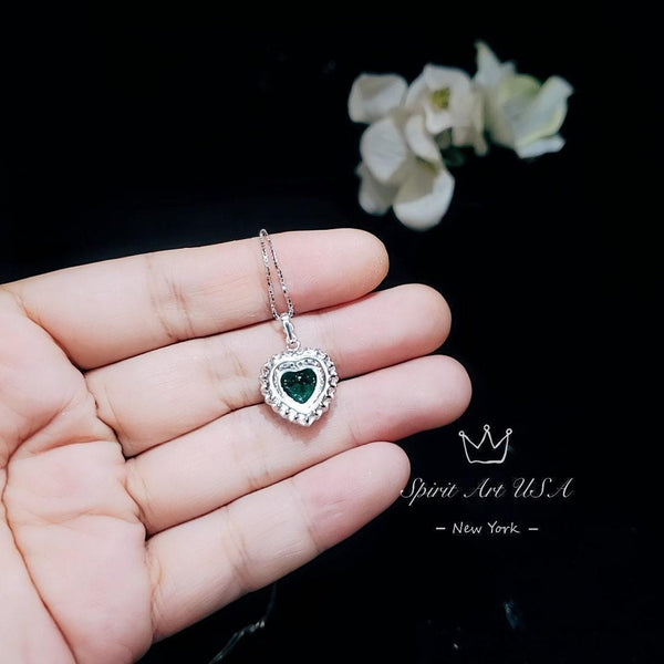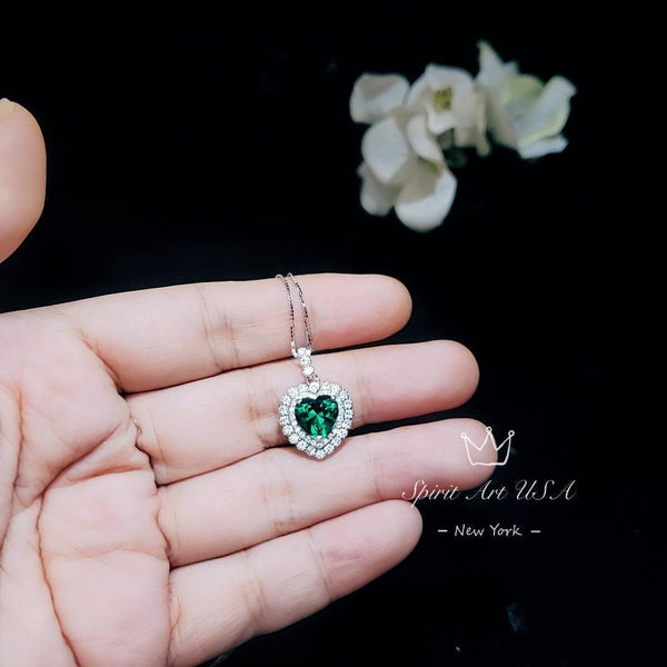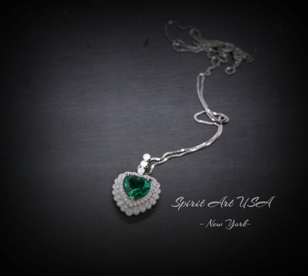 Emerald Necklace - Green Emerald Heart Pendant - Full 925 Sterling Silver 8 MM Double Halo Solitaire Green Heart Emerald Jewelry #429