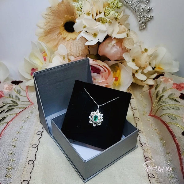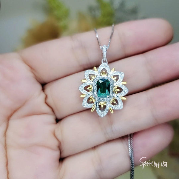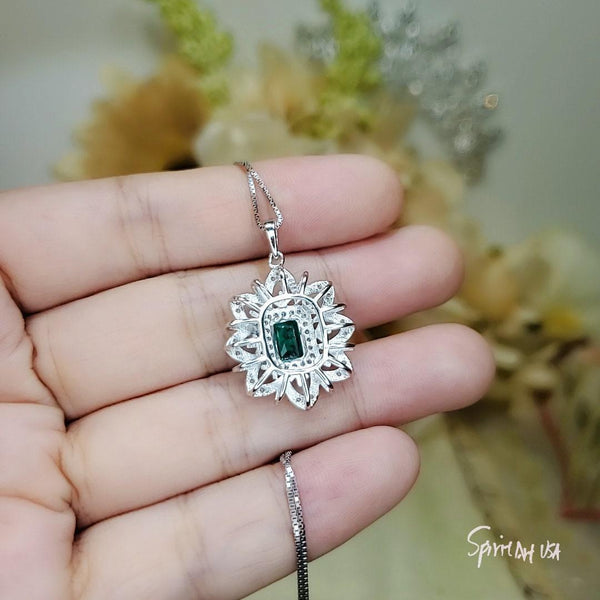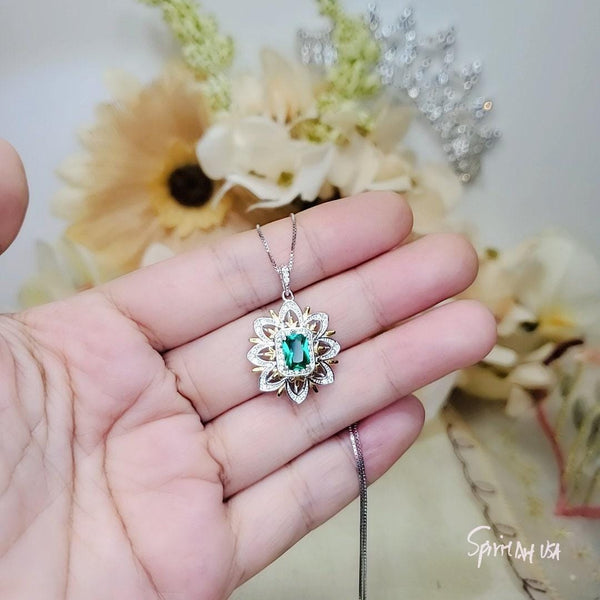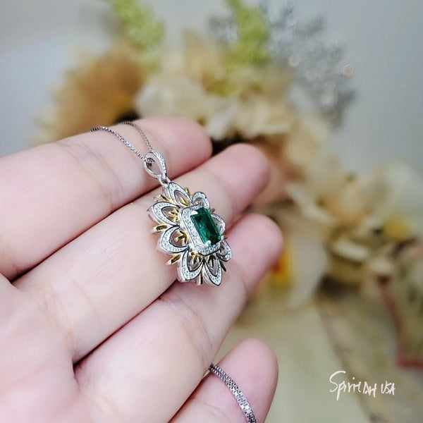 Green Emerald Necklace - Gemstone Water Lily Flower Pendant - 18KGP @ Sterling Silver - 1 CT Emerald Jewelry - Goddess Athena Necklace #651