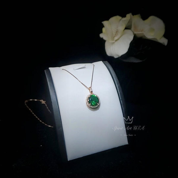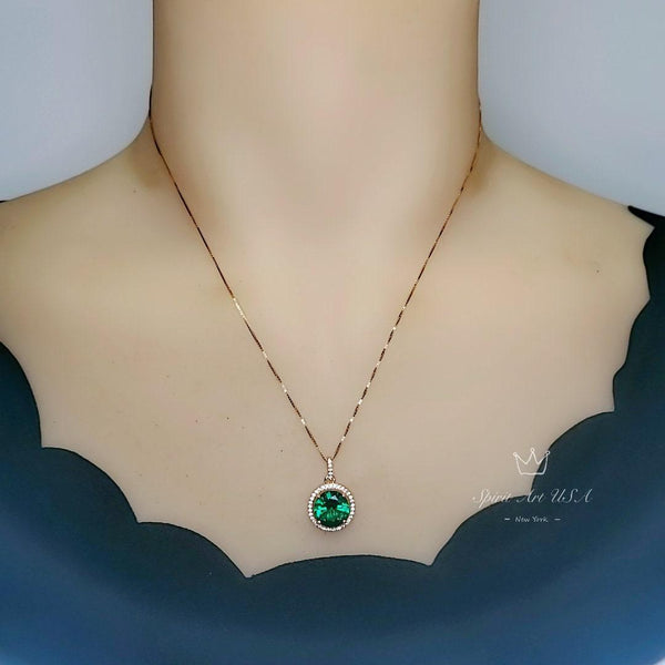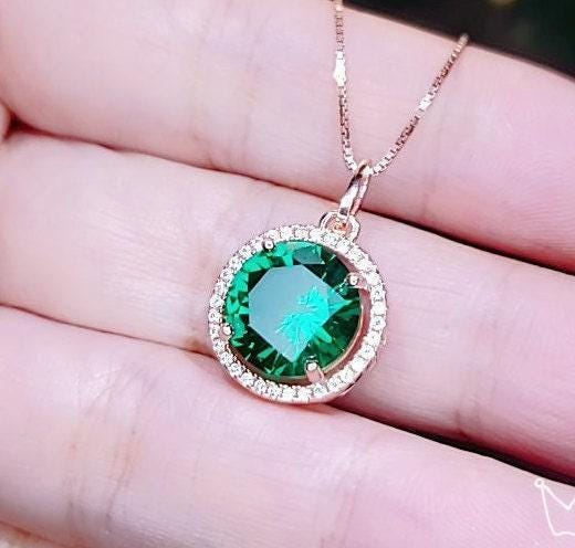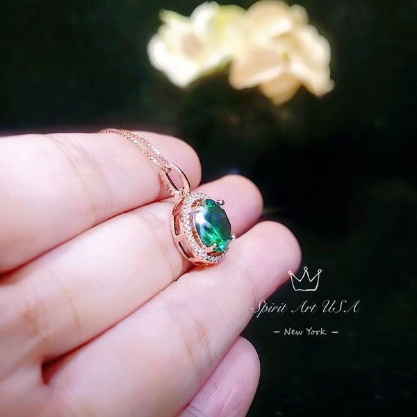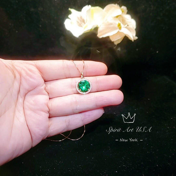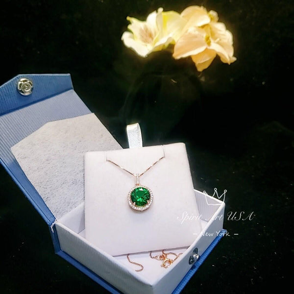 Large Rose Gold Emerald Necklace - 4 CT Round Green Emerald Gemstone Pendant - Sterling Silver Circle Halo Green Gemstone Jewelry #444