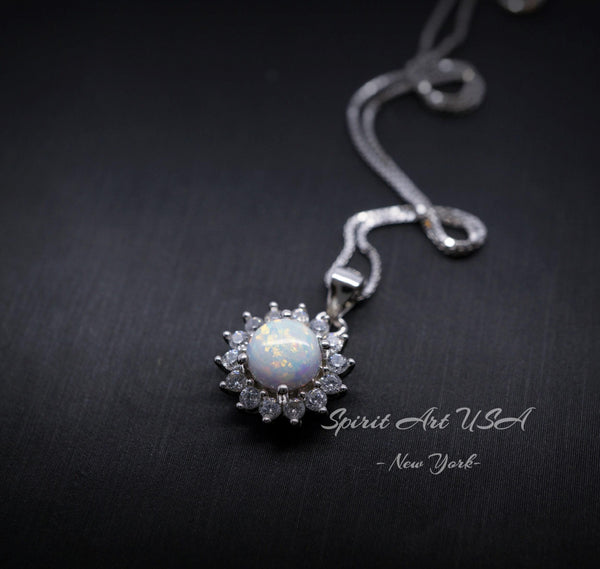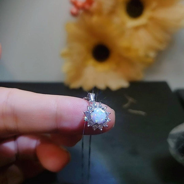 Introducing our exquisite fire opal necklace, inspired by the elegance of Princess Diana. This stunning sunflower-style piece features a brilliant 6mm lab-created white opal, surrounded by sparkling cubic zirconia accents. Crafted with full 925 sterling silver, including a beautifully designed bezel and bail, this choker is both luxurious and timeless.