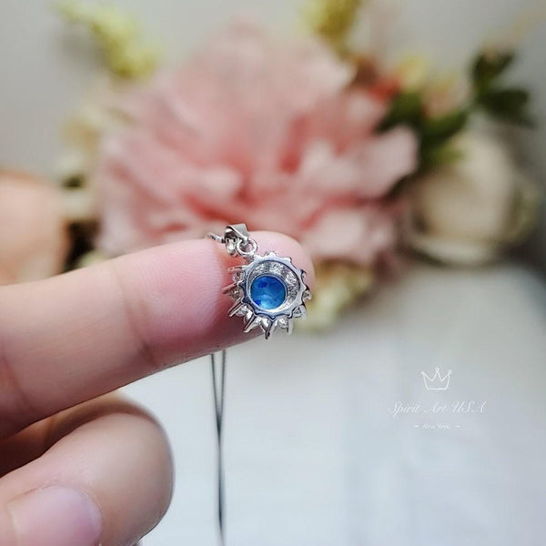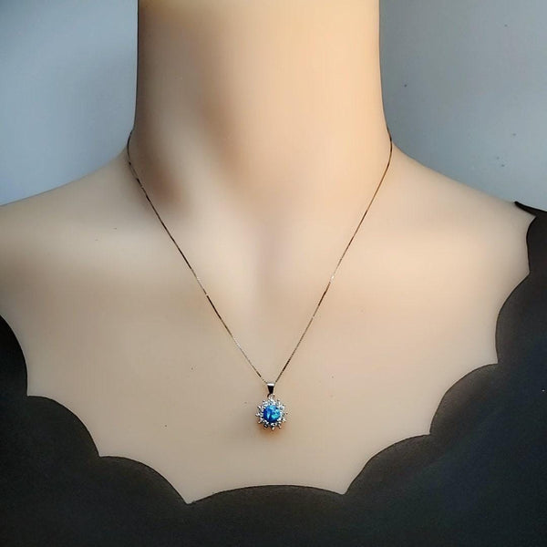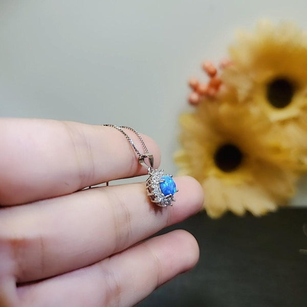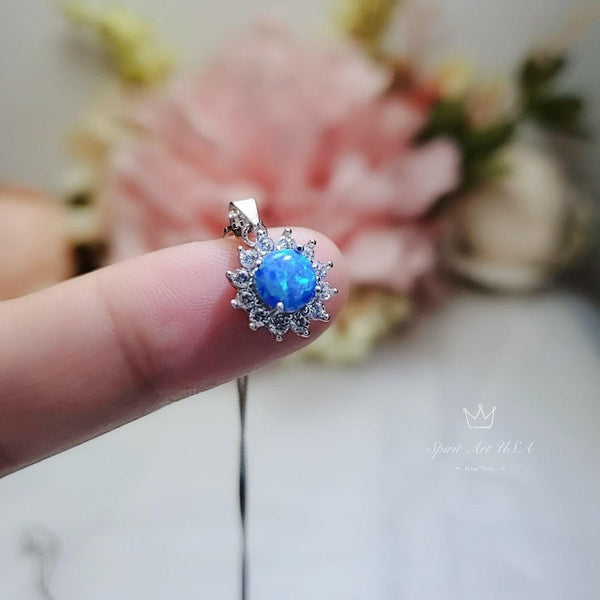 Elevate your accessory collection with our exquisite Tiny Blue Opal Necklace, inspired by the iconic Princess Diana style. This charming piece features a stunning 6mm lab-created blue opal pendant, elegantly set in a platinum-coated solid 925 sterling silver halo. The pendant measures 15mm in height, including the bail, and is complemented by a shimmering simulated diamond accent stone, adding a touch of sparkle to this timeless design.
