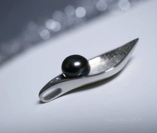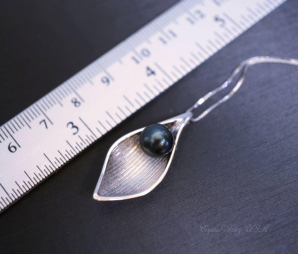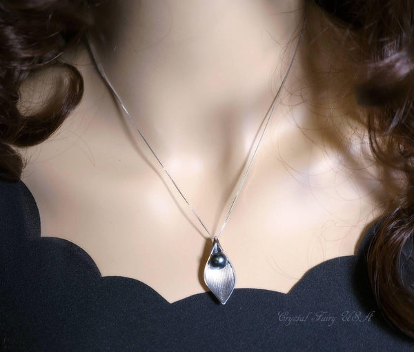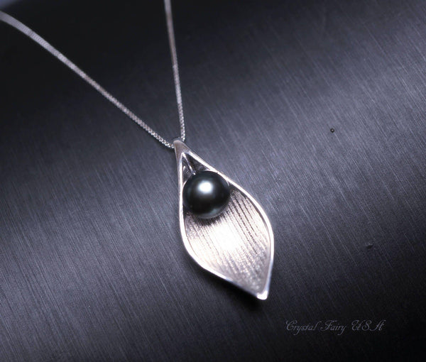 High quality genuine Black pearl sterling silver leaf style necklace