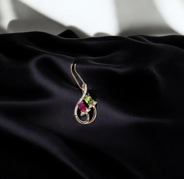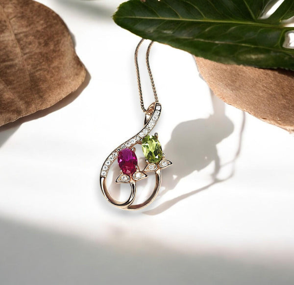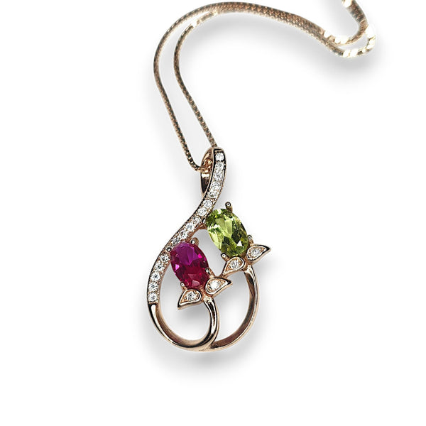 Materials: ruby, peridot, sterling silver, rose gold.