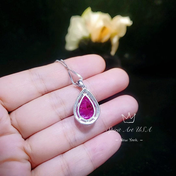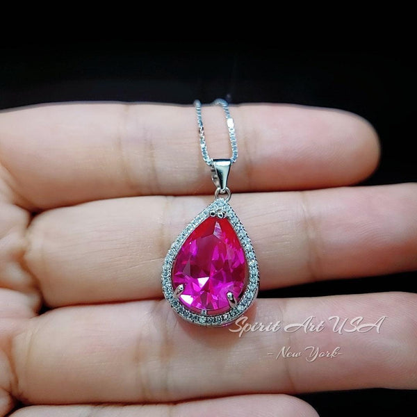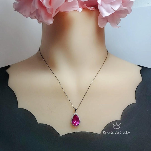 Large Teardrop Pink Sapphire Necklace - Sterling Silver Fuchsia Large 5 CT Pink Sapphire Pendant - White Gold Fuchsia Gemstone Jewelry #746