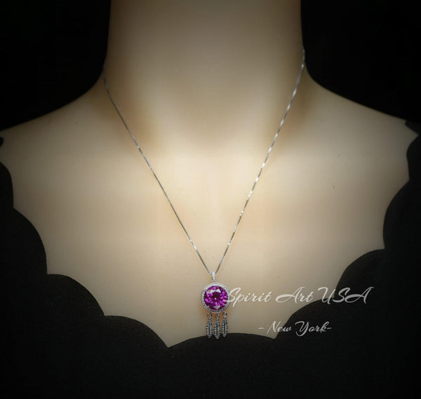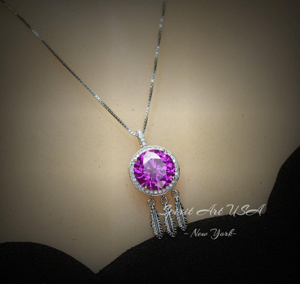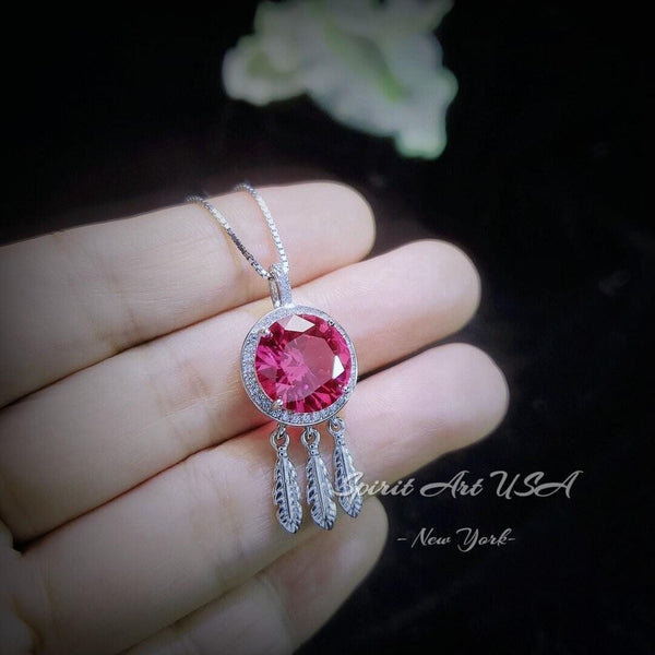 Pink Sapphire Necklace 18KGP @ Sterling Silver Dream Catcher Necklace - 6 CT Round - Large Pink Sapphire Pendant - Dreamcatcher Pendant #771