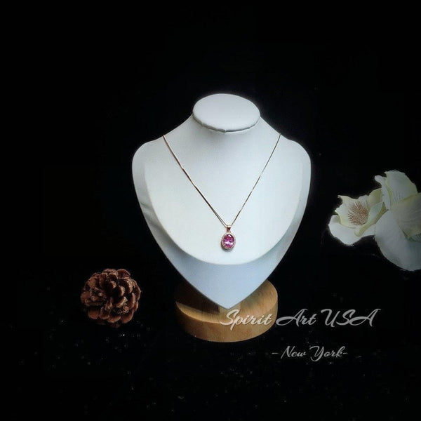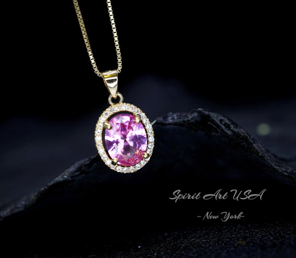 Delicate classic halo oval pink tourmaline necklace with 18KGP @ sterling silver made.,