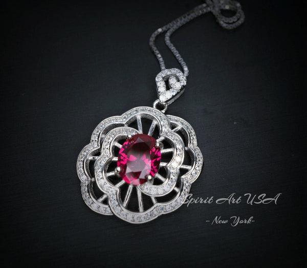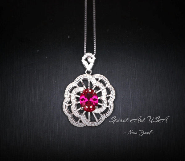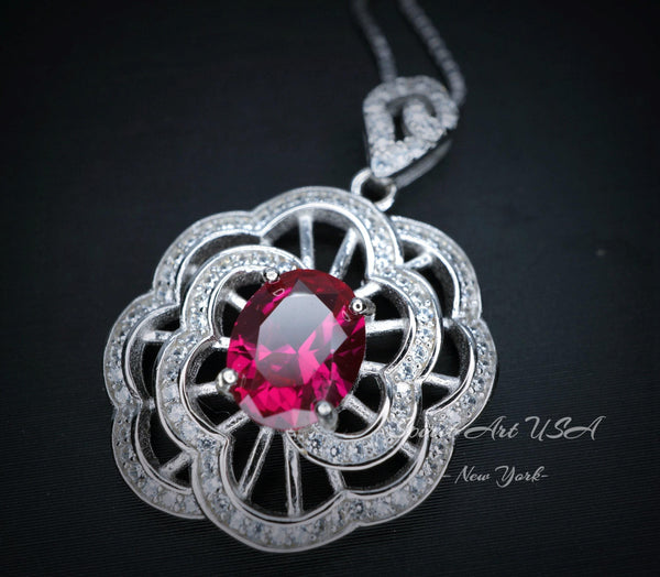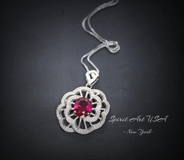 Gemstone Peony Red Ruby Necklace , 2.1 CT Red Ruby Pendant , Large White Gold plated Sterling Silver Flower #761