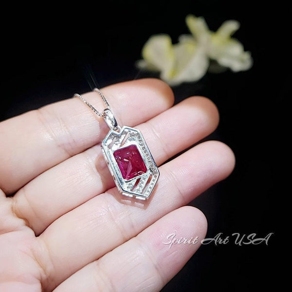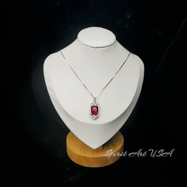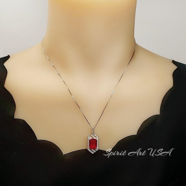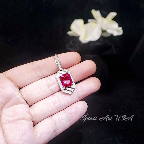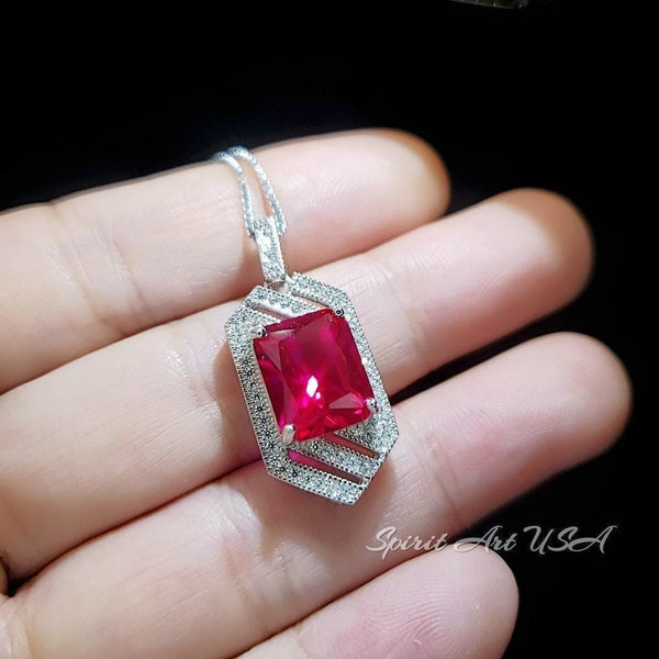 Large Geometric Ruby Necklace - Full Sterling Silver Gemstone Spacecraft Style - 4.5 Ct Rectangle Cut Ruby Jewelry #757