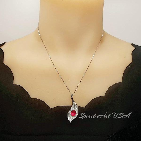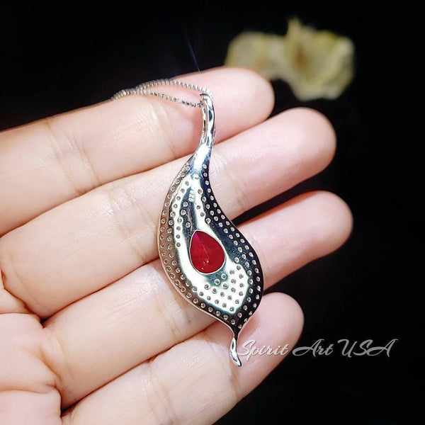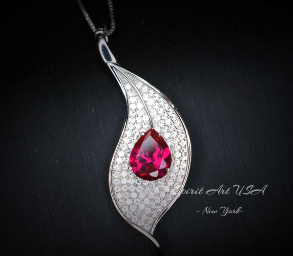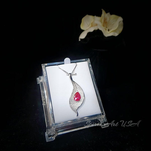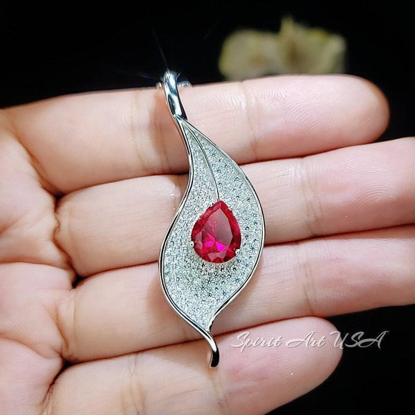 Ruby Necklace - Large Single Gemstone Leaf Necklace - 18KGP @ Sterling Silver - 3 CT Teardrop Red Ruby Jewelry - Large Ruby Pendant #894