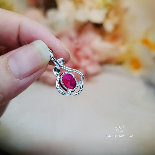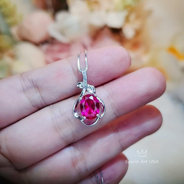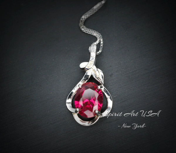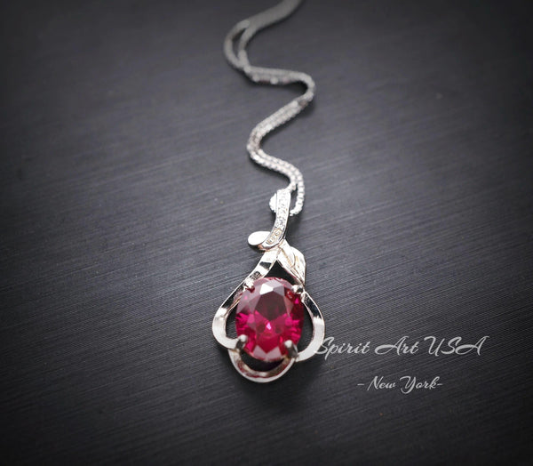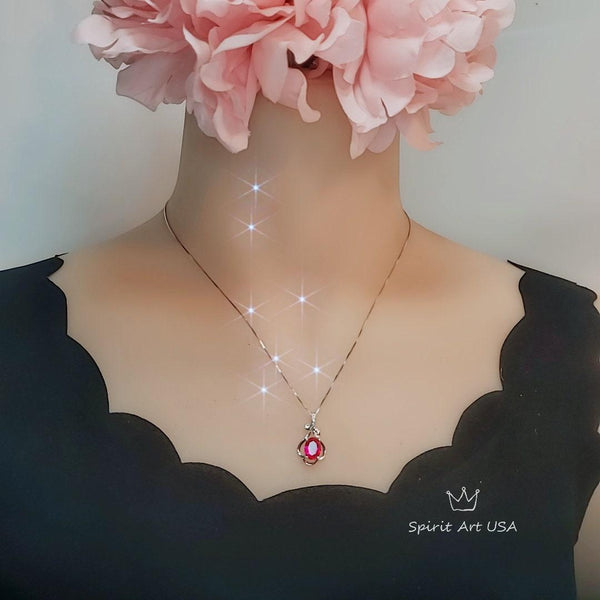 Sterling Silver Red Ruby Necklace 2.1 CT Solitaire Red Ruby Flower Petal Pendant Sterling Silver White Gold Plated July Birthstone #206
