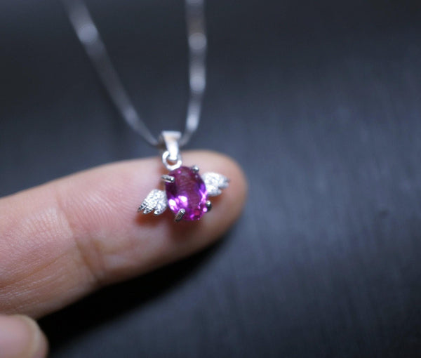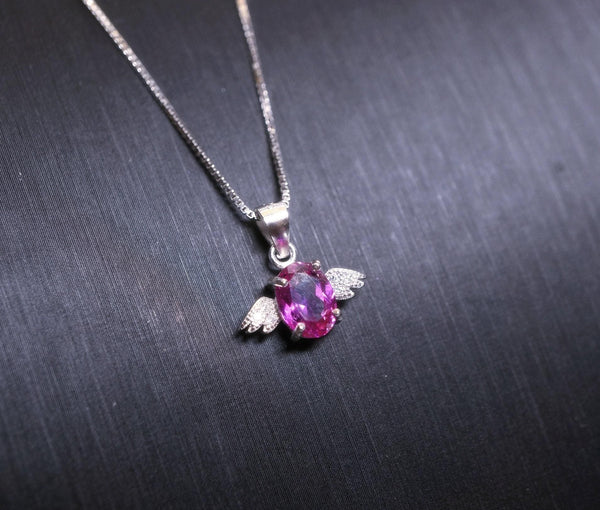 The main stone is a lovely lab-created red ruby, measuring 5 x 7 mm in diameter, securely held in a delicate sterling silver bezel. The necklace comes with a high-quality 0.7 mm glittering platinum-coated sterling silver box chain, offering both durability and a lustrous finish.