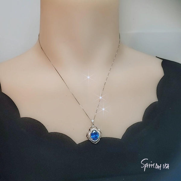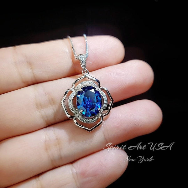 Large Blue Sapphire Necklace - 18kgp Sterling Silver - Flower Of Life Necklace - 4 Ct Solitaire Halo Blue Sapphire Pendant #563