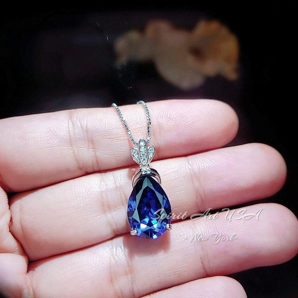 Large Teardrop Blue Sapphire Necklace - 18KGP Sterling Silver September Birthstone - Pear 7 CT Blue Sapphire Jewelry #794