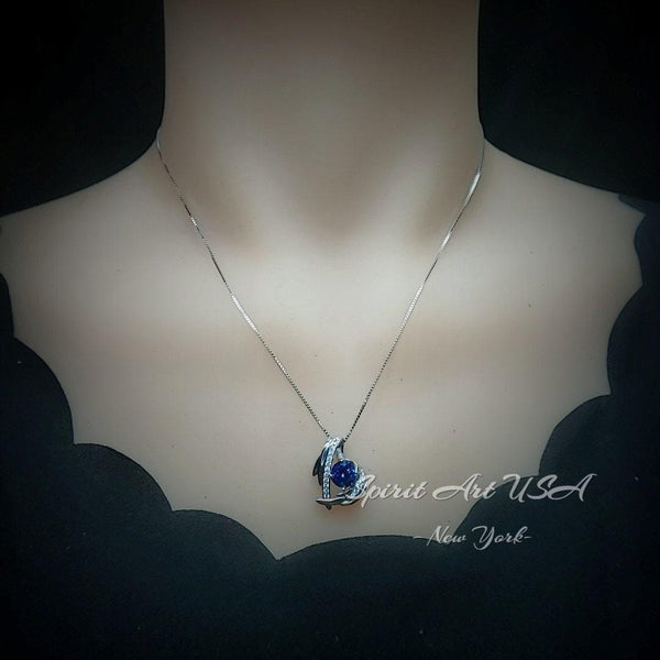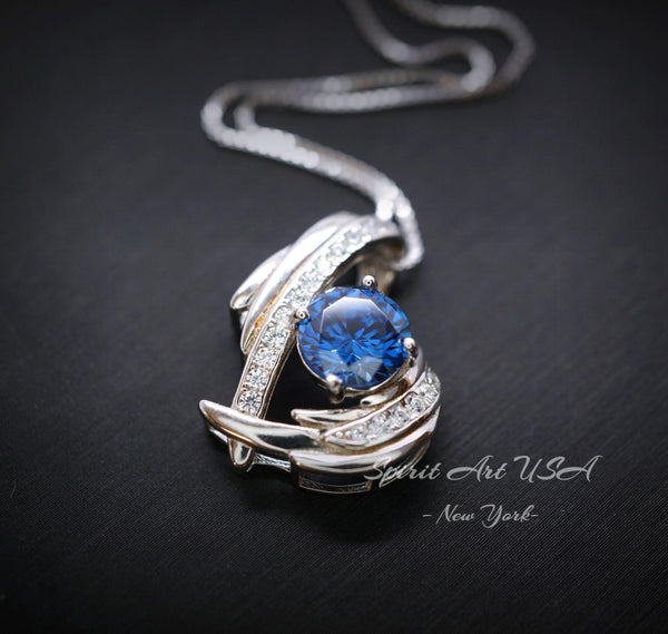 Protective Angel Wing Blue Sapphire Necklace - Sterling Silver White Gold Coated - 2CT Round Cut Blue Sapphire Angel Wing Jewelry #883