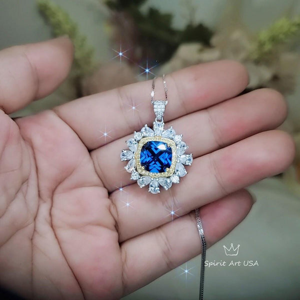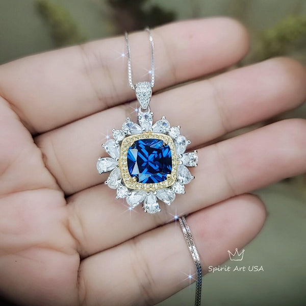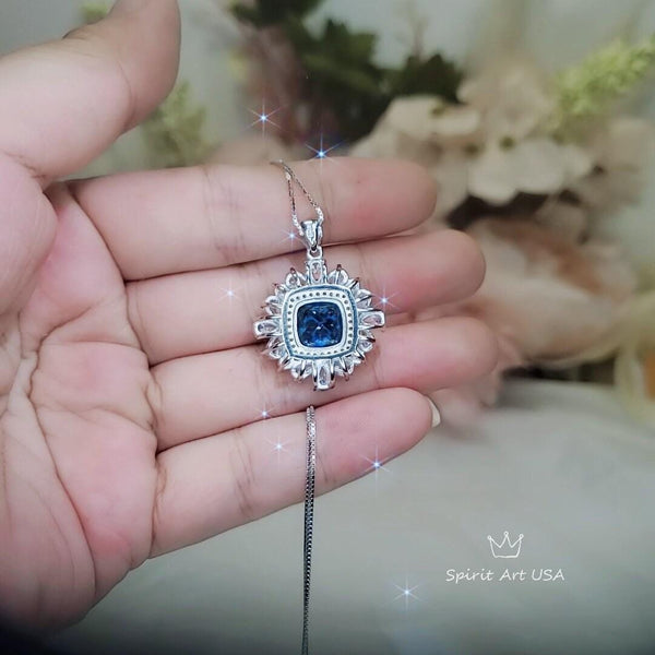 Square Blue Sapphire Necklace - 7 CT Sapphire Pendant - Gemstone Surround Gold Halo Sterling Silver - Large 10 MM Blue Sapphire #806