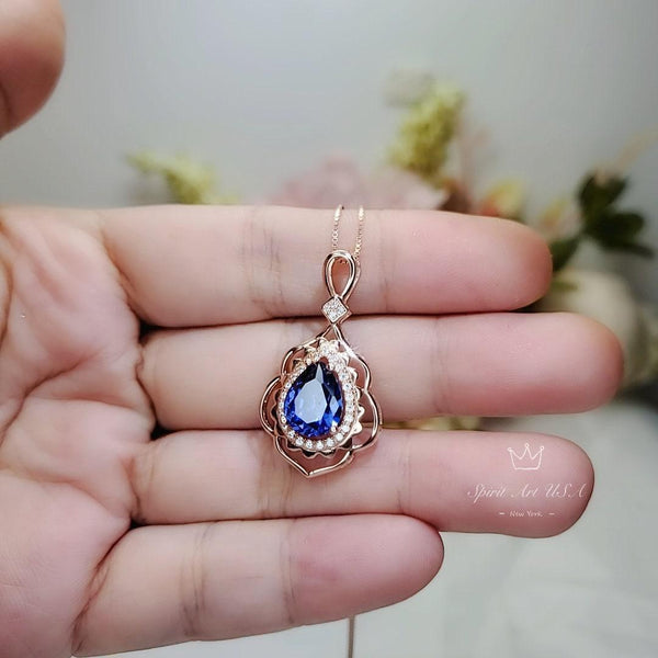 Tanzanite Necklace - Rose Gold 925 Sterling Silver Gemstone Flower Petal Leaf Pear Lab Created Tanzanite Pendant Jewelry #708