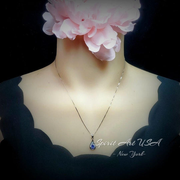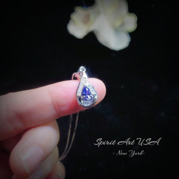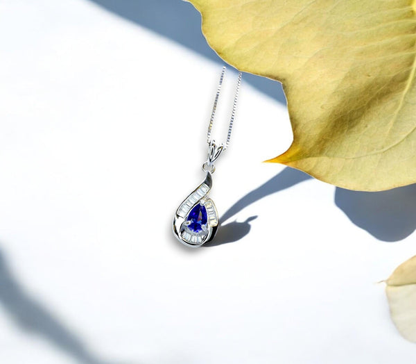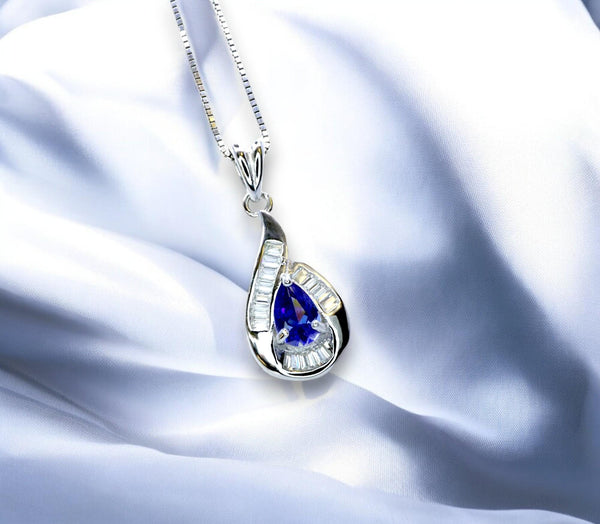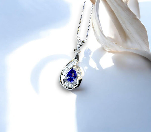 Tiny Teardrop Tanzanite Necklace - Sterling Silver Sim Dimond White Gold Plated Halo 0.5 CT Royal Blue Pear Pendant Minimalist Style 088
