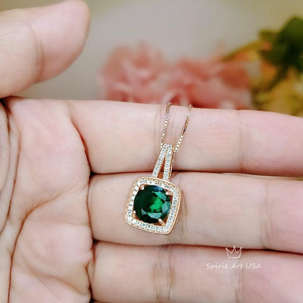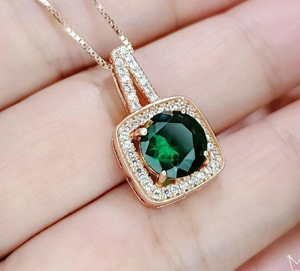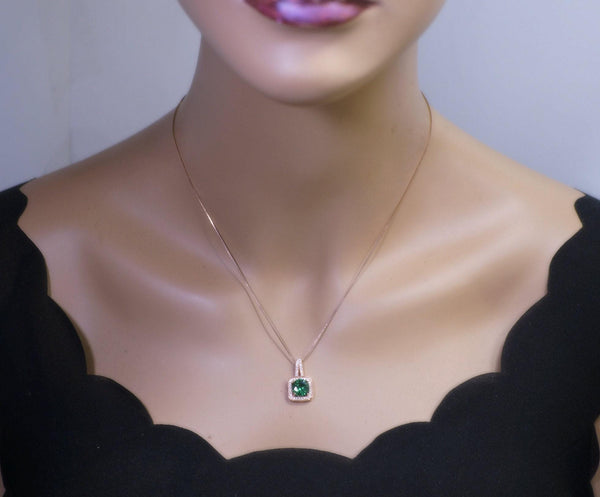 2 CT Emerald Necklace - Gemstone Square Halo Rose Gold plated Sterling Silver round cut emerald pendant #141