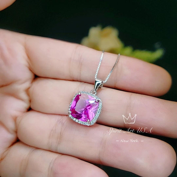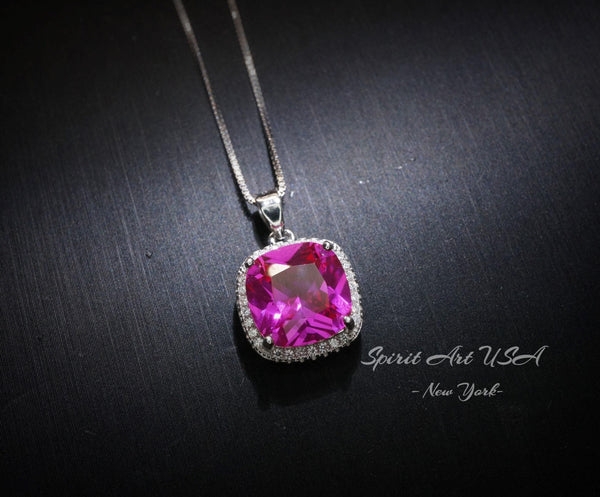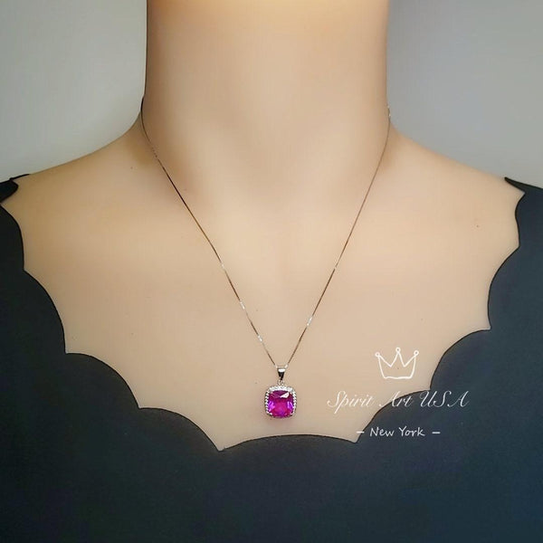 6CT Fuchsia Pink Sapphire Necklace - Large Square Sterling Silver White Gold Plated - Pink Sapphire Jewelry #462