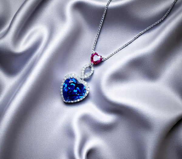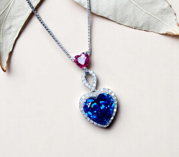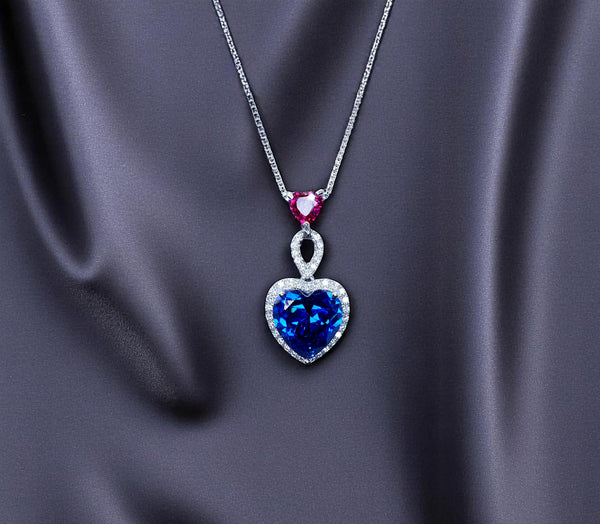 Celebrate love and elegance with this stunning double heart pendant necklace. Featuring a 5-carat lab-created blue sapphire, this piece is set in white gold-coated sterling silver, offering a timeless and romantic design perfect for any occasion.